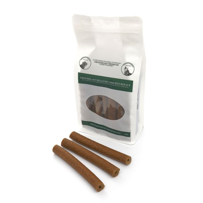 Koud geperste treat. Rijk aan gezonde kip en tarwe glutenvrij. Ook verkrijgbaar in de vorm van een treat (zie Greenheart Healthy Chicken Treats).