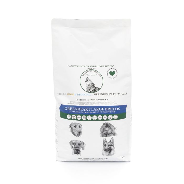 Greenheart Large Breeds is rijk aan kip met vis. Overgangsvoeding na Greenheart Puppy All Breeds en/of Greenheart Puppy Medium/Large Breeds afhankelijk van het ras. Greenheart Large Breeds is ook geschikt voor de oudere hond. Gering aan fosfor.