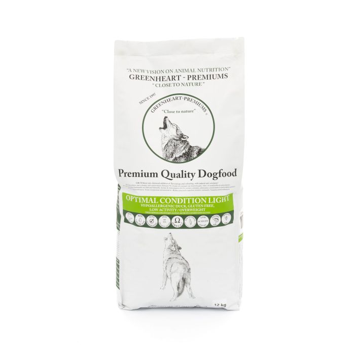Greenheart Optimal Condition Light is rijk aan eend. Hypo allergeen met een dierlijke eiwitbron. Geschikt bij seizoens-onafhankelijke eiwitverteringsstoornissen (huid, haar en/of vacht problemen). Voor honden met gering activiteiten niveau dus ook bij overgewicht. Gering aan vet. Rijk aan essentiële vetten zalm & borage olie.