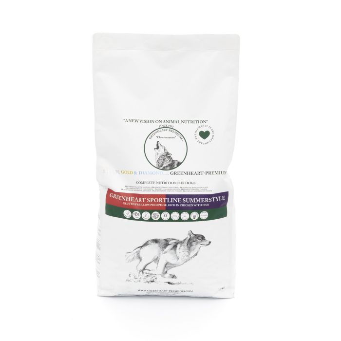 Greenheart Sportline Summerstyle is rijk aan kip met vis. Sportvoeding voor honden die in rust periode verkeren. Greenheart Sportline Summerstyle is ook geschikt voor de oudere hond. Gering aan fosfor.